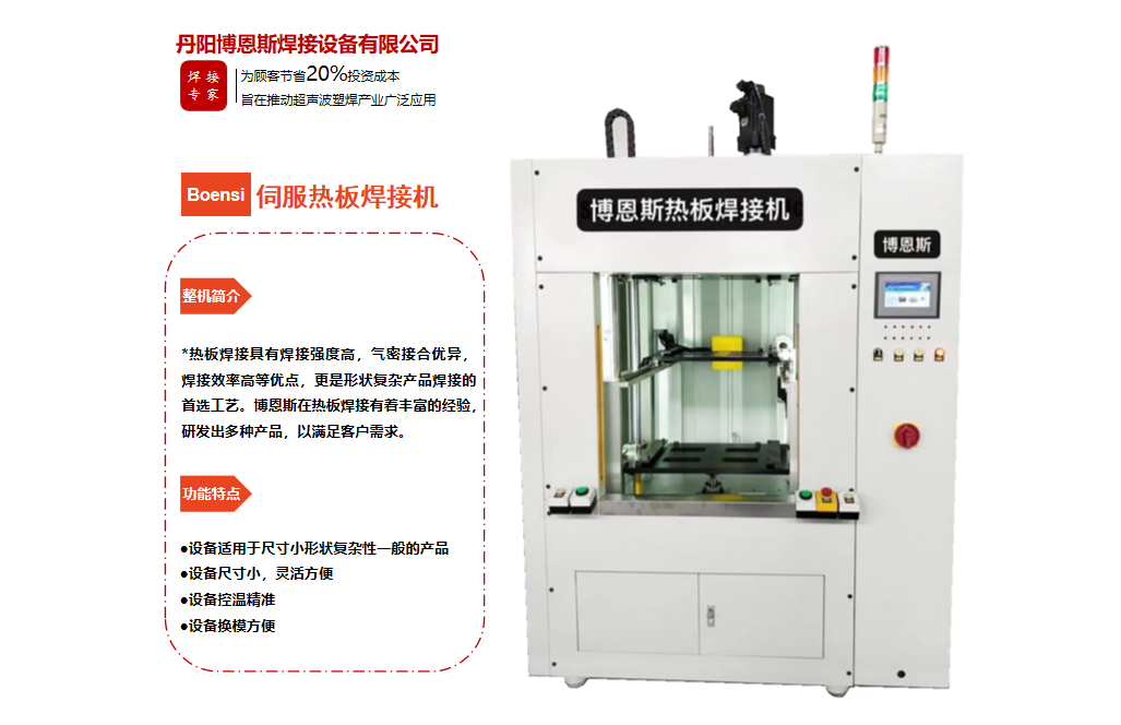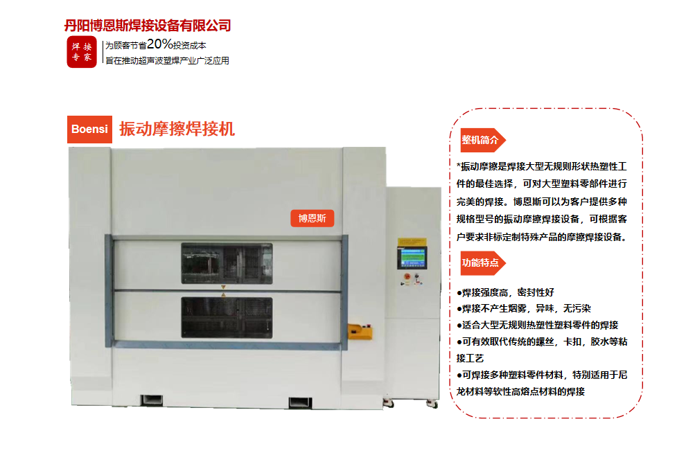 丹陽博恩斯焊接設(shè)備有限公司是塑料焊接領(lǐng)域集研發(fā)設(shè)計(jì)、生產(chǎn)制造、銷售服務(wù)為一體的企業(yè)。公司自成立以來堅(jiān)持“以人為本”的理念,組織了一支強(qiáng)大的技術(shù)研發(fā)團(tuán)隊(duì),攜多年來積累的豐富經(jīng)驗(yàn),并結(jié)合國際先進(jìn)塑料焊接技術(shù),根據(jù)市場(chǎng)需要,不斷開發(fā)具有核心競(jìng)爭(zhēng)力的新產(chǎn)品。公司具有很強(qiáng)的非標(biāo)機(jī)械研發(fā)、設(shè)計(jì)、生產(chǎn)能力,可為廣大客戶定制各類專用機(jī)械設(shè)備。公司設(shè)計(jì)生產(chǎn)的塑料焊接設(shè)備已廣泛應(yīng)用于汽車、電子、家電、醫(yī)療器械、無紡布...